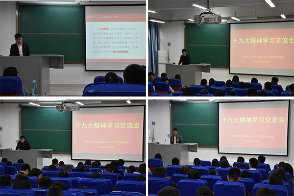为深入学习贯彻党的十九大精神,引导青年学生深刻领会党的十九大的科学内涵和精神实质,2018年10月18日下午,材料与化学工程学院在化工楼218室开展了“十九大精神学习交流会”。学院各年级团支部代表参加了本次会议。