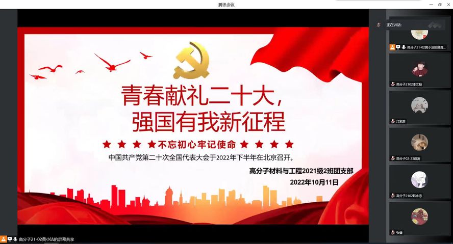 思想之道领航向,人间正道开新篇。通过本次“青春献礼二十大,强国有我新征程”主题团日活动使我院的青年团员们更加坚定了听党话,跟党走的思想觉悟,材化青年必将谨记习近平总书记的话语并秉持“赶考”般的清醒和坚定,时刻保持“斗罢艰险又出发”的顽强意志,为全面建设社会主义现代化国家和新时代中国特色社会主义贡献自己的力量。
