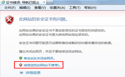 1、通过IE浏览器打开https://vpn.zzuli.edu.cn,出现如下页面,单击“继续浏览此网站(不推荐)”打开用户认证页面。(特别提醒:推荐使用IE8及其以上浏览器或者使用Google Chrome,Firefox火狐浏览器)