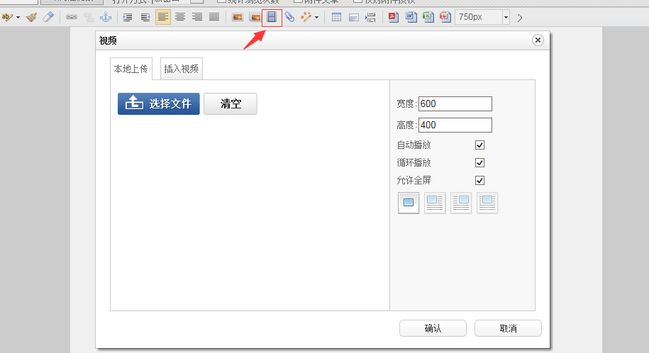 点击工具栏“附件”按钮,选择文件。视频格式必须为swf、flv、mp4格式,大小不得超过100M。