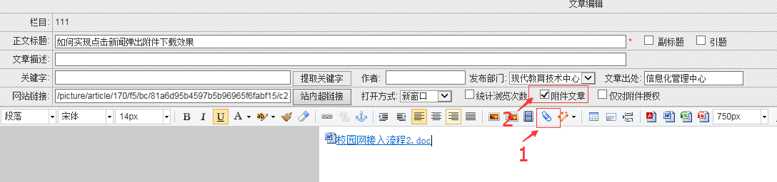 插入附件——选中“附件文章”复选框,点击“发布”。