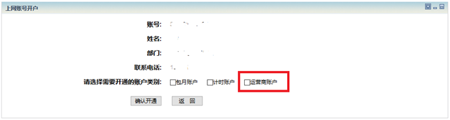 4、勾选运营商账号类别后点击确认开通,开通后帐号为学号。操作界面如图4: