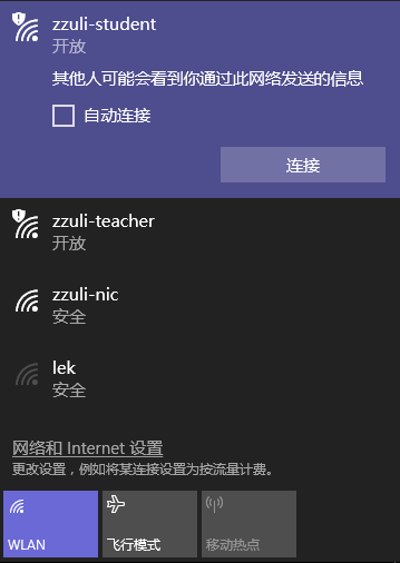 ①在东风校区、科学校区的任意无线网络覆盖区域,连接zzuli-student,如图8所示。