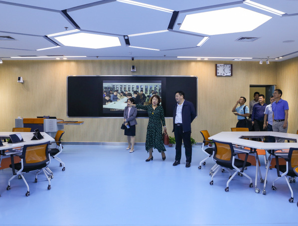 信息化管理中心主任李霞汇报了学校近两年智慧校园的建设情况,以及新时期学校将信息技术与教育教学的深度融合的建设成效,详细介绍了学校智慧教学环境、智慧课堂以及智慧教学管理的建设和应用情况,并就教学质量监控平台、学业预警、成绩分析以及学校大数据服务等应用进行了演示。高等教育处一行还实地考察了智慧教室、虚拟演播厅、微课制作室等教学信息化环境设施,并就教学信息化建设方面的问题进行了深入交流。