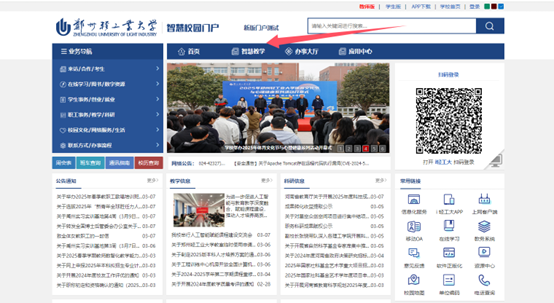 1. 进入学校智慧校园门户(https://campus.zzuli.edu.cn/),点击导航“智慧教学”专题网站。