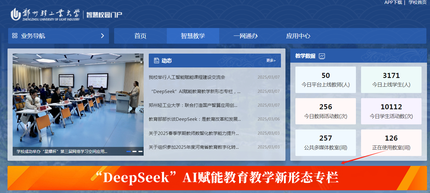 为推动人工智能技术与教学深度融合,全面提升学校教育教学质量,鼓励教师多层次多维度探索研究DeepSeek技术的应用与推广,积极探索AI赋能教育教学新路径,助力新学期智慧教学加速度。智慧教学专题网站新上线了“DeepSeek”AI赋能教育教学新形态专栏。访问途径如下: