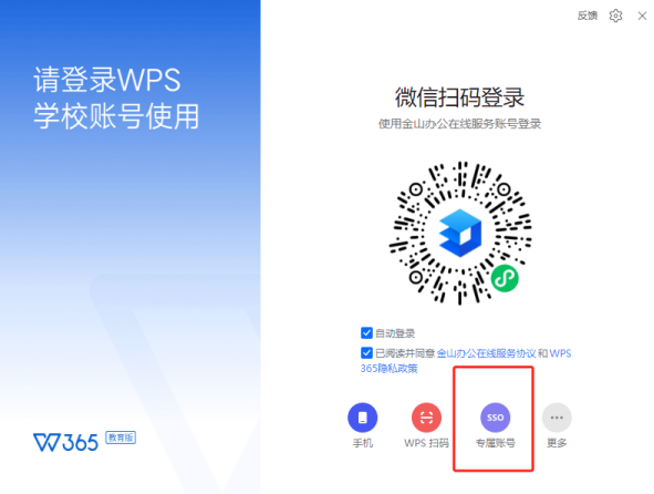 打开WPS软件首页,点击右上角“立即登录”,选择“SSO 专属账号”。输入企业代码 “zzuli”,接下来用学校统一身份认证信息登录,即可完成登录。