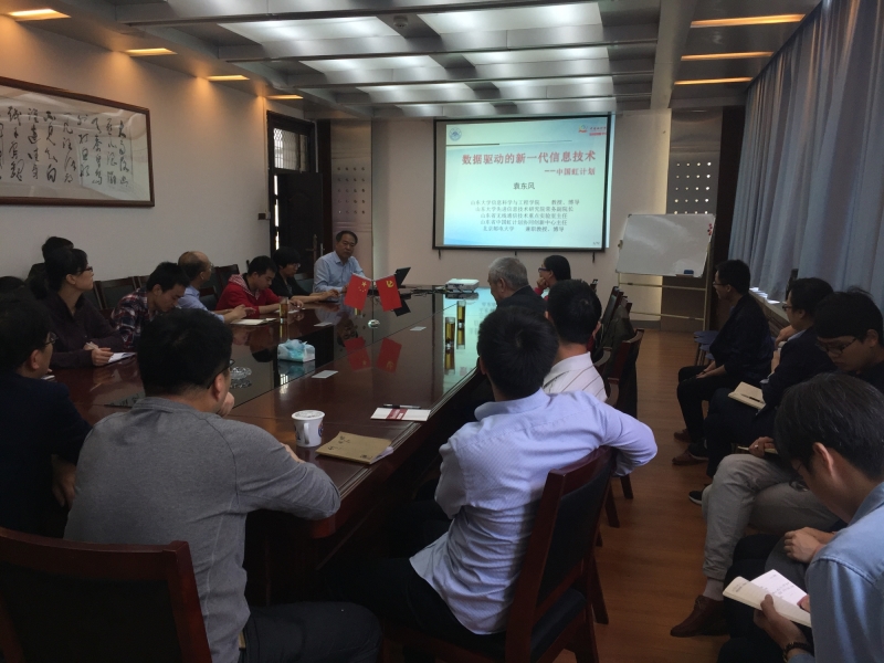 东风教授首先做“数据驱动的新一代信息技术——中国虹计划”学术报告,报告首先探讨大数据的特点和应用,然后介绍云计算和雾计算的核心技术以及中国虹计划的发展历程,接着介绍大数据分析的经典算法和实际应用案例,最后对数据技术在未来技术进步中的驱动作用进行展望。袁东风教授的报告内容深入浅出、精彩纷呈,使学院师生受益匪浅。报告结束后,袁东风教授与青年博士对大数据的应用及技术进行了互动交流。