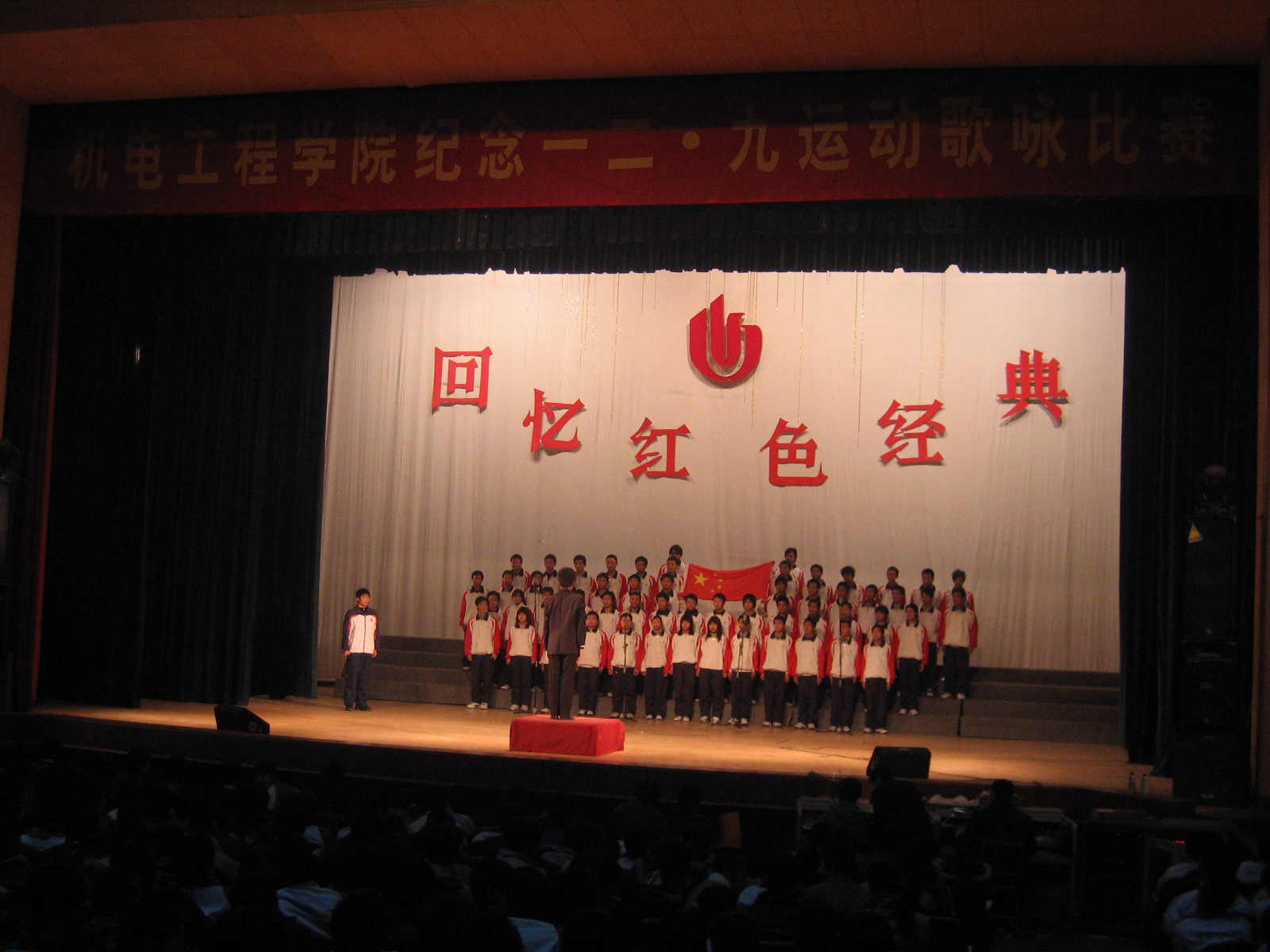 歌咏比赛以班级为单位,机电工程学院2006、2007级十六个合唱队伍献上了一曲曲激情飞扬的爱国歌曲。比赛现场座无虚席,掌声、喝彩声连绵不断。参赛的班级针对此次比赛都做了充分的准备,他们纷纷以独特的风格在舞台上亮相,用洪亮的歌声表达对革命先烈的敬仰与缅怀之情。 比赛共评出一等奖两名,二等奖四名,三等奖十名。最后,邵老师为一等奖获奖班级颁奖。