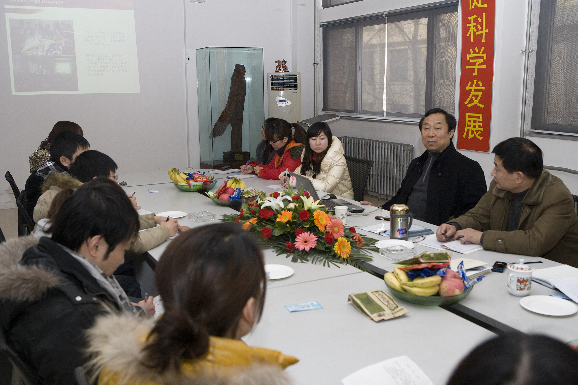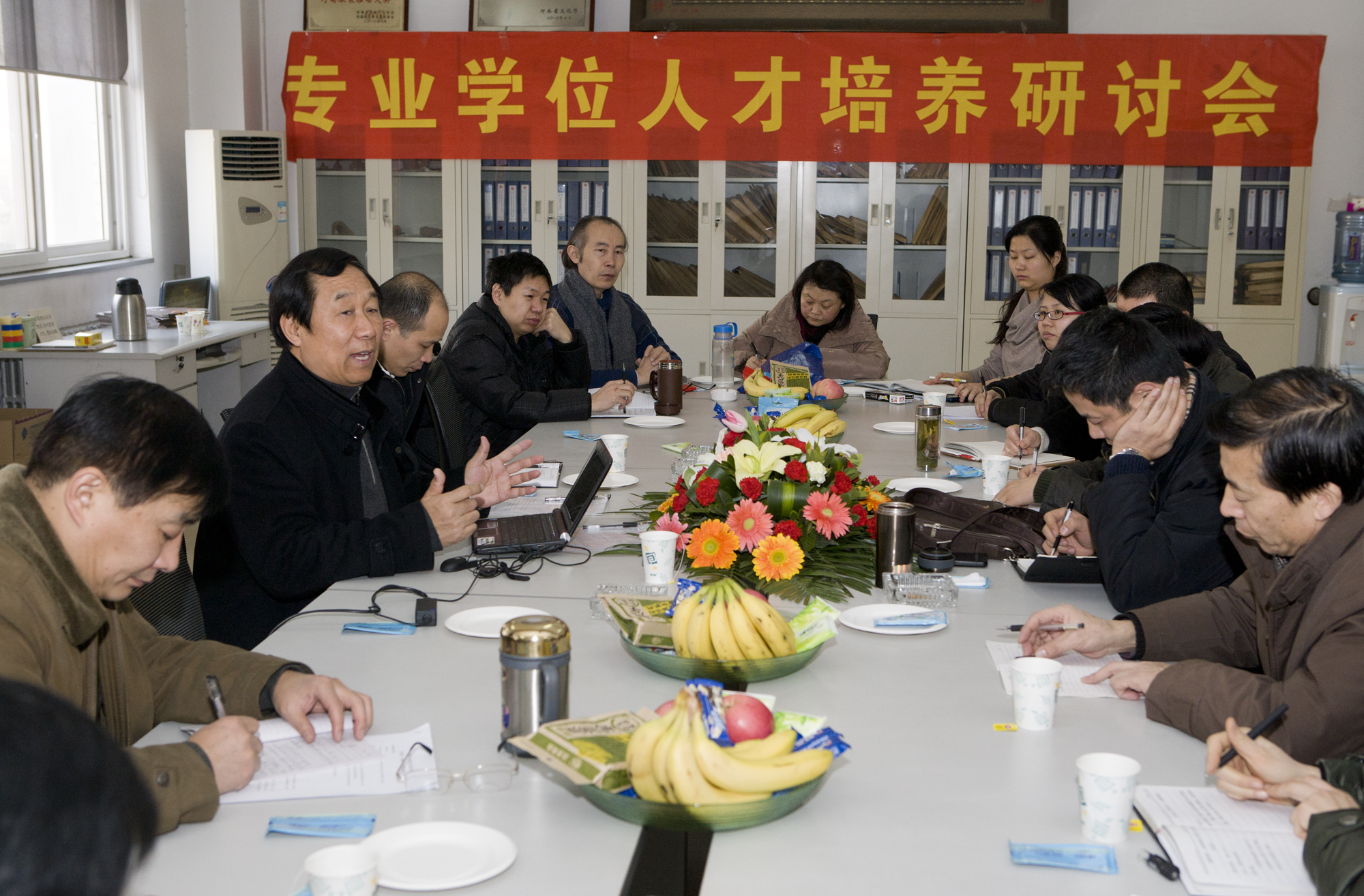 2011年1月12日,武汉理工大学艺术与设计学院原院长,博士生导师陈汉青教授应邀到我校讲学。参加上午座谈会的有研究生处处长王新杰教授,艺术设计学院院长曹阳教授,副院长任留柱教授及硕士生导师、学位课授课教师。陈汉青教授主要为我们介绍如何培养专业学位人才,在培养方案与课程设置方面如何区别与学术型研究生等急需解决的问题。