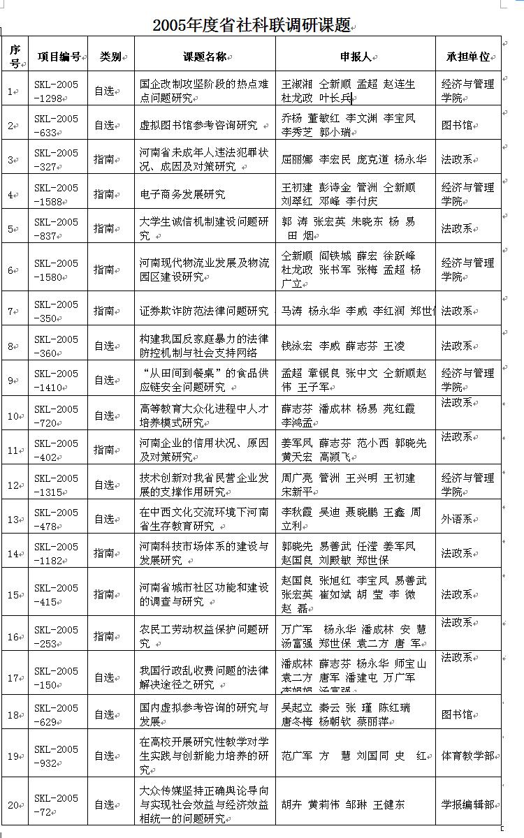 2006年度河南省社科联调研课题开始申报,请从河南省社会科学界联合会网站主页(http://www.hnskl.org)上下载课题申报表。2005年度课题结项成果随2006年度课题申报一并进行,学校报送截止时间为2006年3月4日。详细情况见河南省社科联通知。