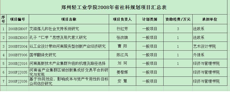 2008年河南省社科规划项目评选工作结束,我校有7项课题获准立项,其中5个项目获得经费资助,共资助经费7万元。本年度获立项项目数、经费数都取得了较大进展,具体情况如图所示。