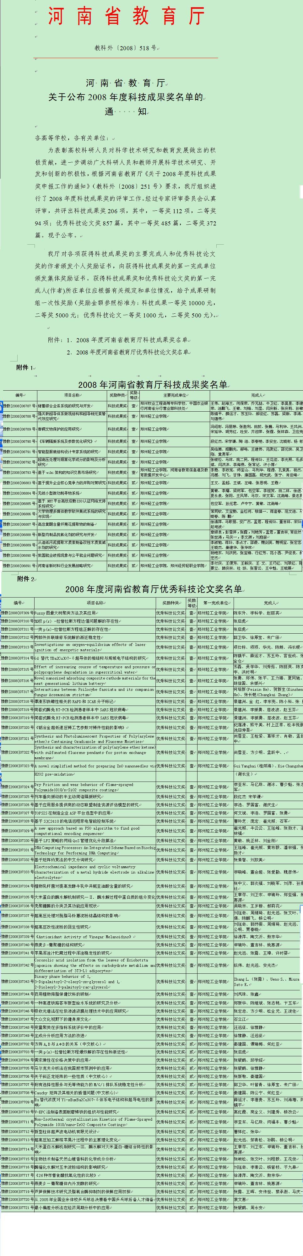 河南省教育厅2008年度科技成果奖评审结束,我校共有76项成果获奖,其中6项成果获科技成果一等奖;9项成果获科技成果二等奖;41篇论文获优秀科技论文一等奖;20篇论文获优秀科技论文二等奖。详细情况见下图。