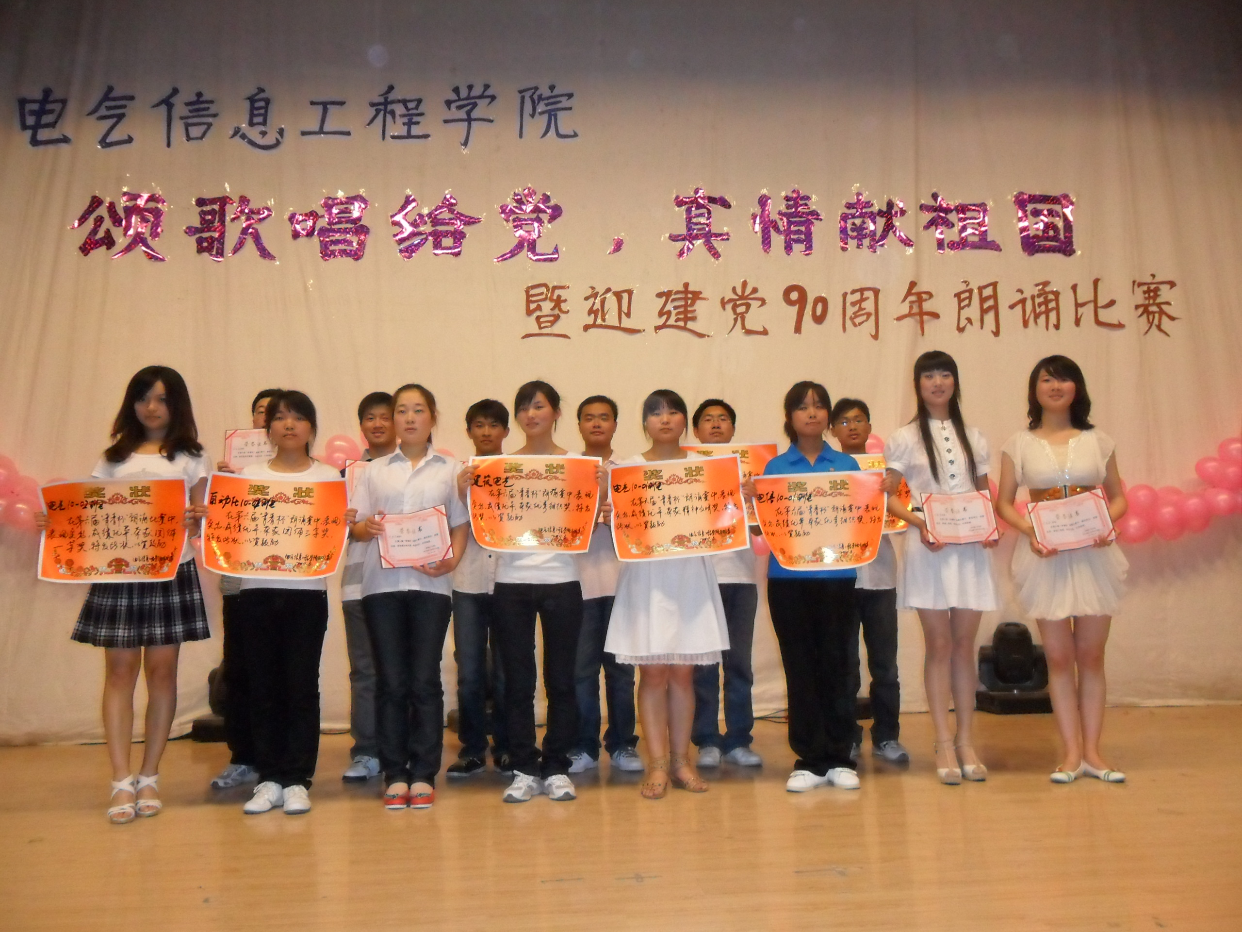 值建党九十周年之际,为加强当代青年大学生的思想政治教育,正确抒发同学们爱党爱国之情,为党的生日献礼,5月15日下午,电气信息工程学院在科学校区电教楼208举办了“颂歌唱给党,真情献祖国――暨迎建党九十周年朗诵比赛”。比赛分为独诵和合诵两部分,2010级各班组成14支队伍参赛。电气学院辅导员老师出席比赛并担任评委。