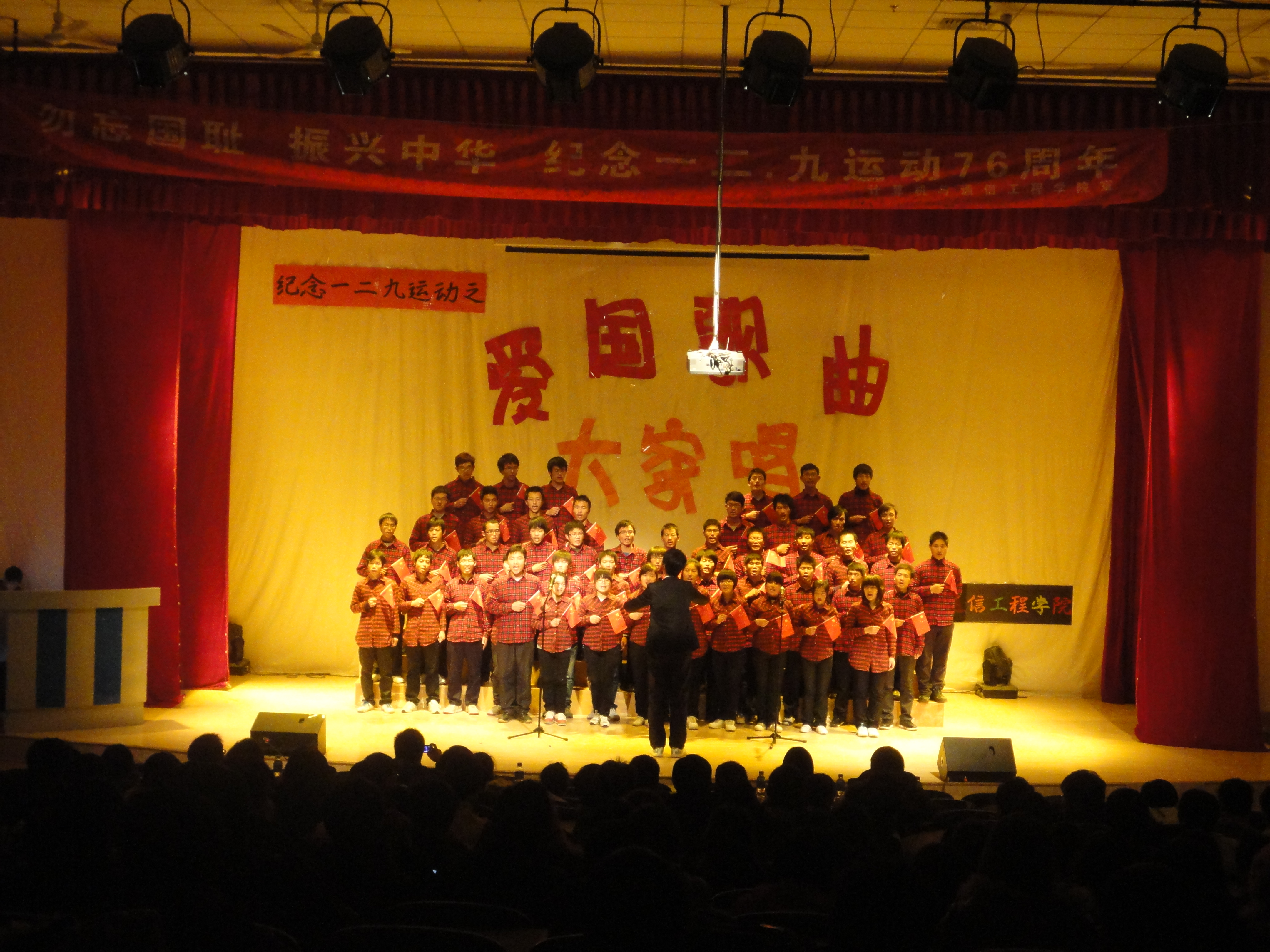 为响应校团委号召,在我院学生中传承“12.9”精神,抒发爱国主义情怀,2011年11月29日,我院在科学校区208教室举行爱国歌曲大家唱活动。分团委书记宋文军、各位辅导员老师及全体11级学生参加此次活动。
