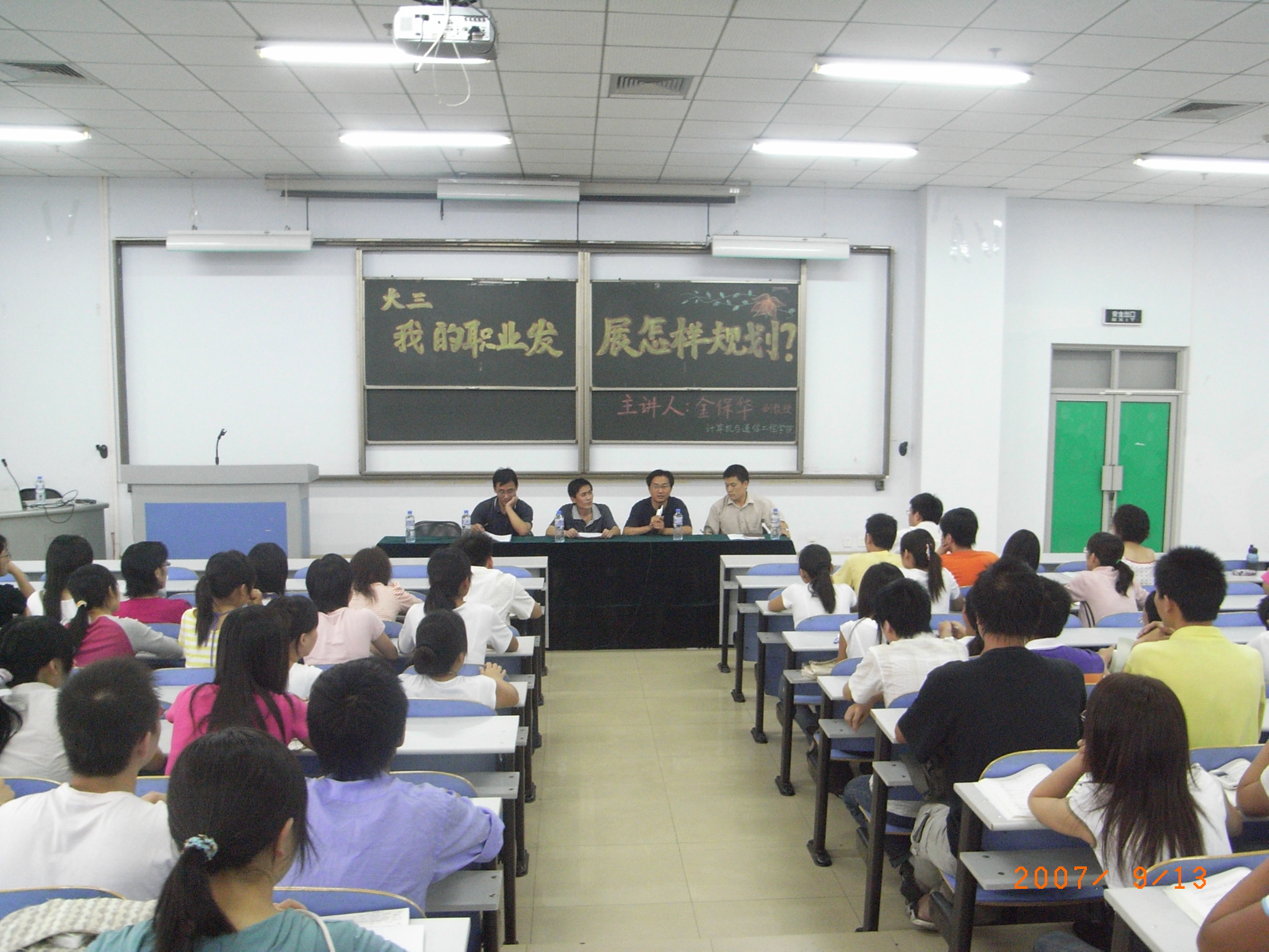 本次讲座是我院启动在高年级开展学生职业发展规划工作的一部分。为充分发挥广大教师在指导学生成长成才方面的作用,使学生能够正确及时地制定大学最关键时期的学习和生活目标,我院聘任了金保华副教授担任05级计算机专业导师、张勇副教授担任05级通信专业导师、夏永泉博士担任05级电子专业导师,李健勇老师担任05级网络专业导师,希望使高年级学生能够在制定专业发展计划、职业设计、考研、就业发展等方面得到更加专业和及时的指导。