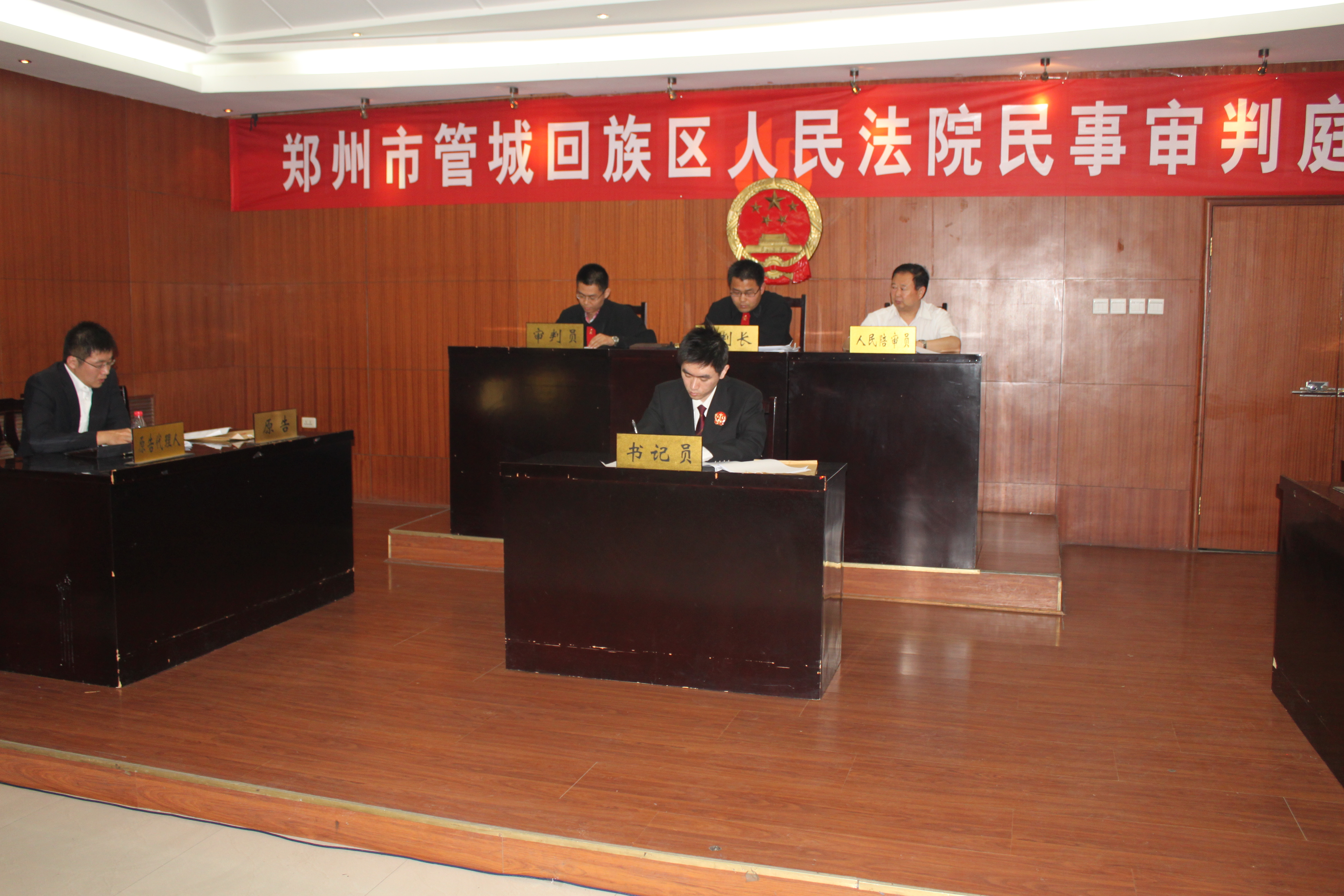 上午,郑州市管城回族区人民法院民事审判庭在我校政法学院模拟法庭,公开开庭审理董某某诉高某某交通事故侵权纠纷一案,我校教务处张东初处长、政法学院刘春兵院长、政法学院闻英副院长、法学教研室部分教师以及新疆民政班和法学2010级全体学生到庭旁听庭审。九点三十分,随着书记员的一声“全体起立,请审判长、审判员入庭!”,身着法袍的审判长、审判员步入法庭,庭审在庄严的气氛中正式开始。本案的争议焦点为:原告董某某的受伤与被告高某某的碰撞行为之间有无因果关系?原被告双方及其诉讼代理人围绕争议焦点展开唇枪舌战,庭审持续了一个半小时,经过法庭调查、法庭辩论、合议庭合议等法定环节,最后,审判长当庭宣判:驳回原告诉讼请求。