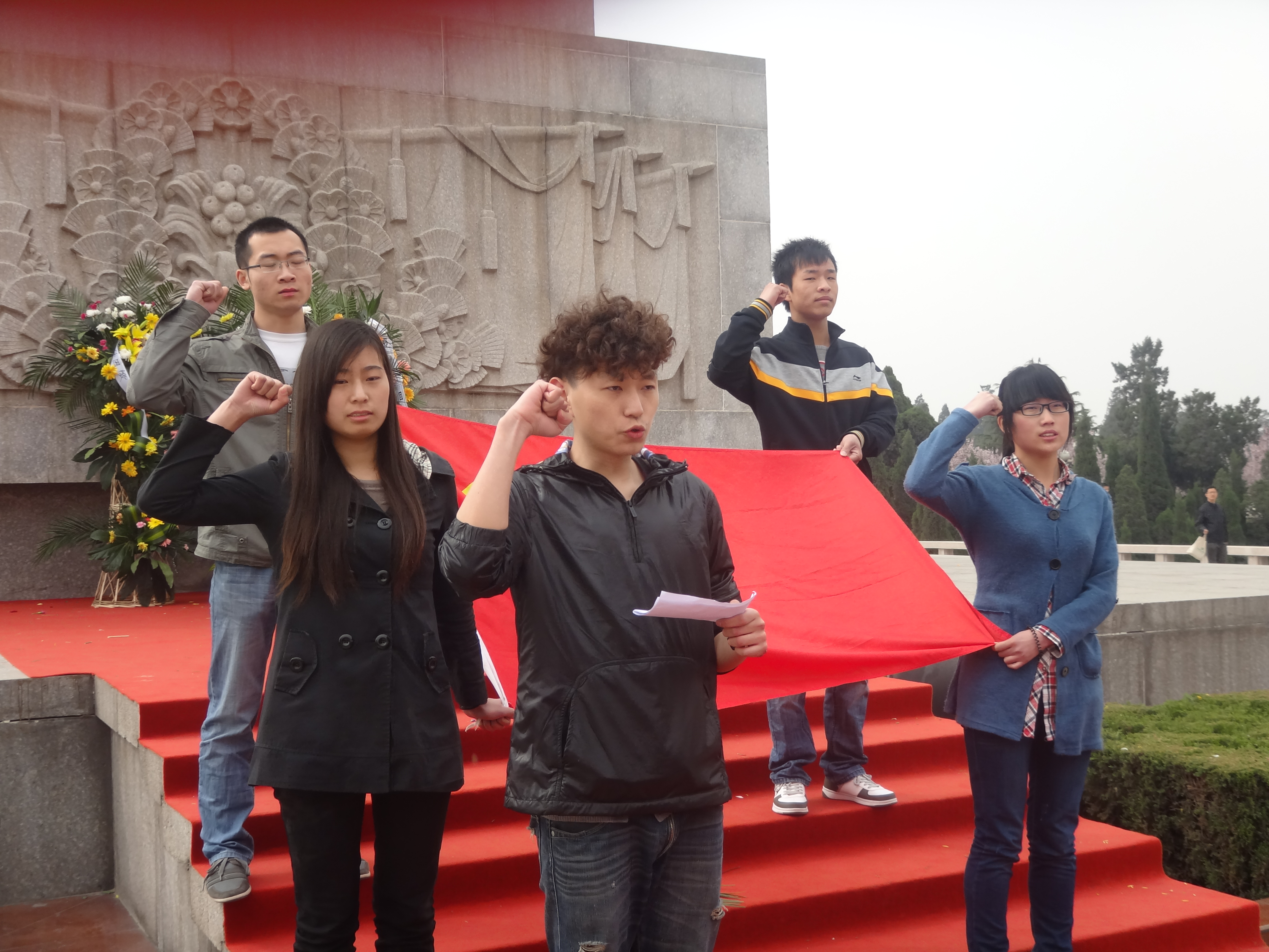 现场,同学们都被深深地感染了,大家齐声高唱国歌,抒发自己的满腔豪情。然后由学生会秘书处代表陈祯带领大家进行宣誓仪式,坚定了大家要继承革命先烈的遗志,为祖国奉献青春的信念。最后,大家在高耸的烈士纪念碑下合影,从而把这一刻定格在了记录历史的影像与永远的记忆中。