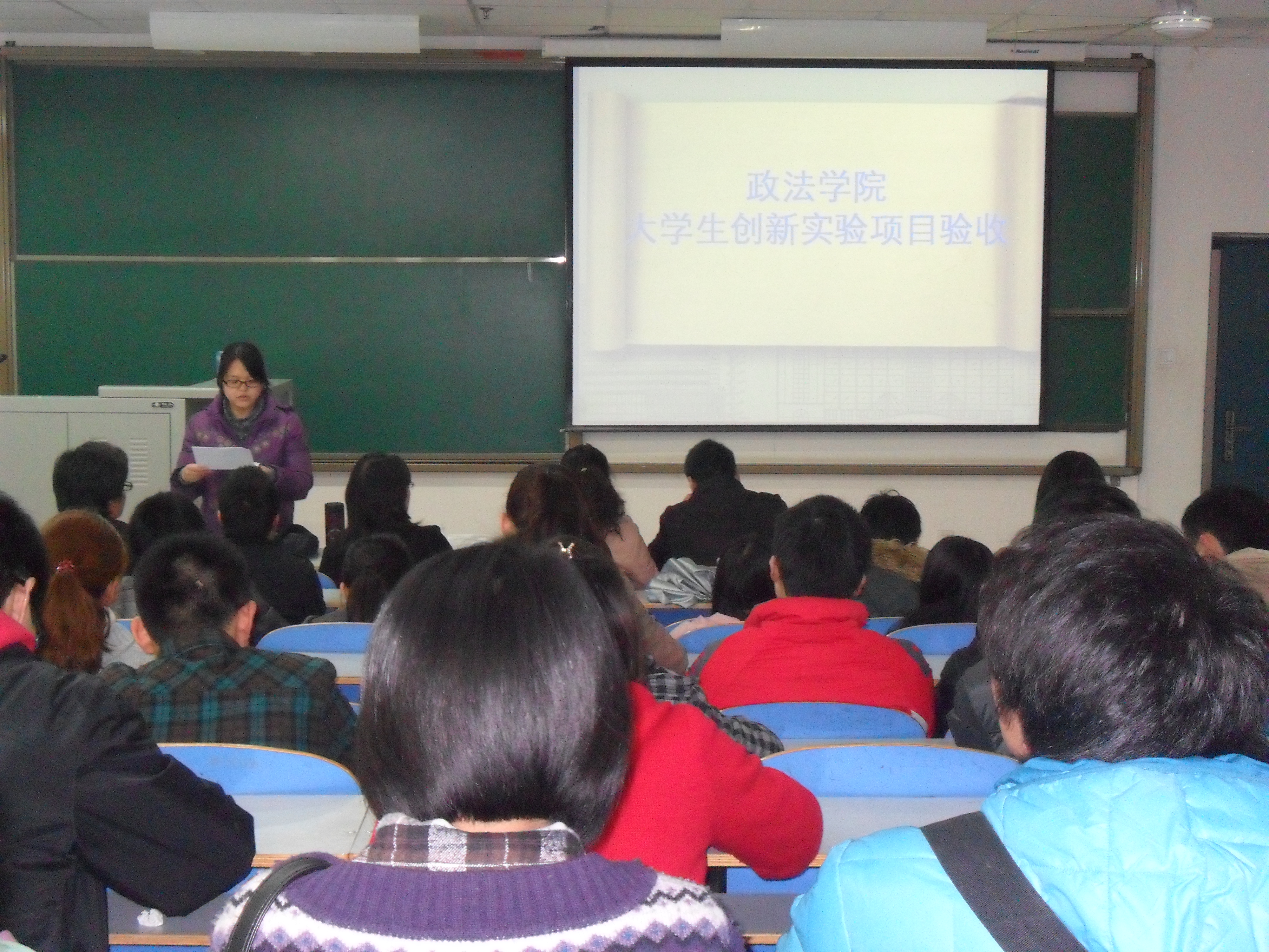 2012315日下午14:30,政法学院大学生创新实验项目验收汇报会在科学校区主教楼217举行。副院长闻英老师、分团委书记张宏英老师、郝宏杰老师、康少霞老师及各项目组成员参加了此次汇报会。汇报会由张宏英老师主持。