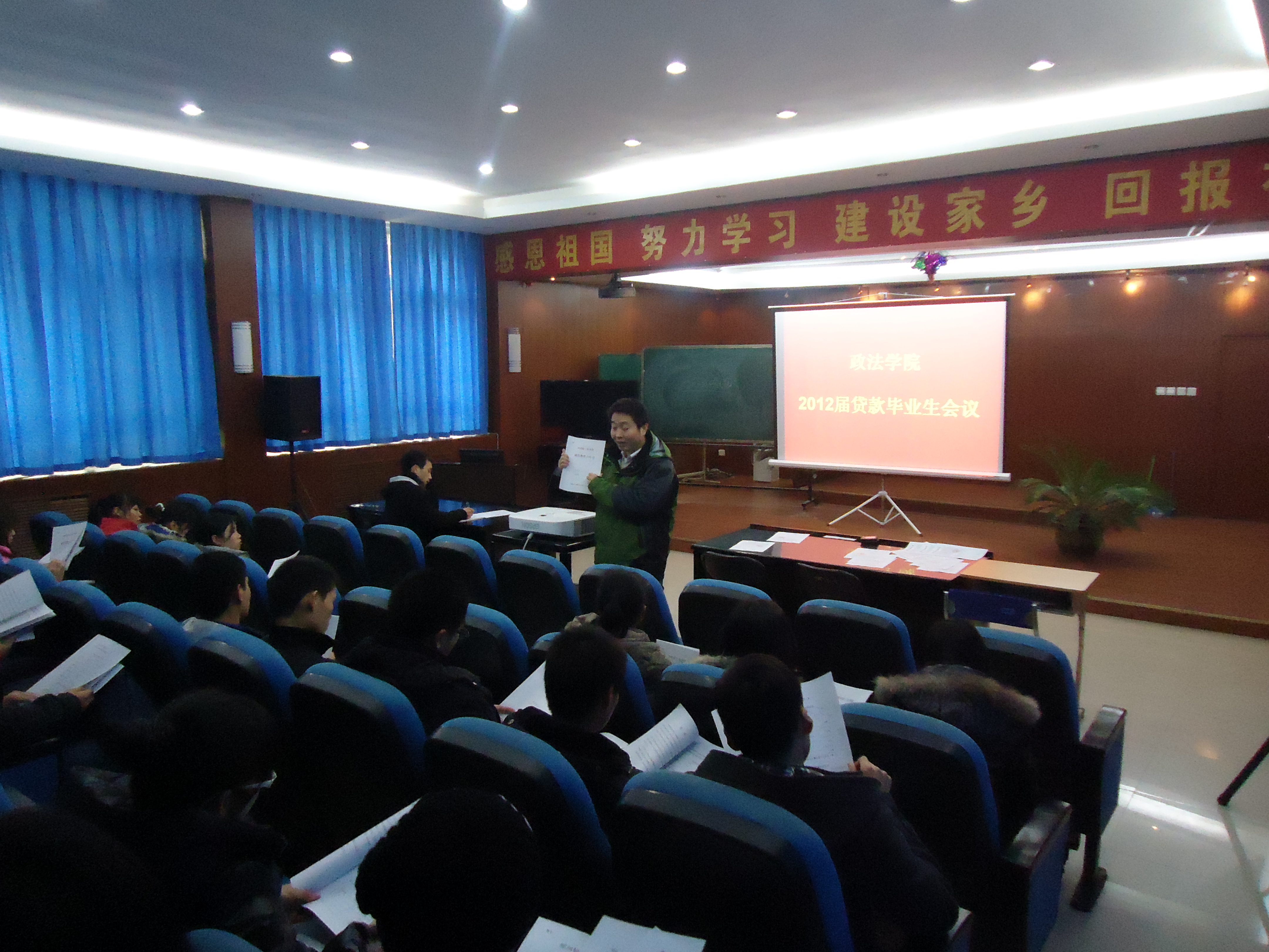 12月20日中午12:20,政法学院在教二楼民政班教室再次召开“2012届贷款毕业生会议”,政法学院党总支副书记郭祥远老师、负责贷款的辅导员、全体贷款毕业生参加了本次会议。