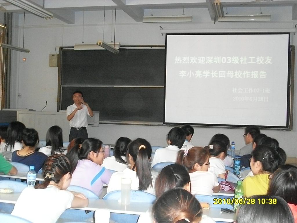6月28日,政法学院社会工作专业03级校友,深圳彩虹社会工作服务中心社工李小亮在教三楼108教室为社会工作专业07、08级学生做了一场精彩的报告。李小亮校友从自己亲身经历出发,耐心讲解了对社会工作的理解以及社工专业的前景、沿海发达城市社工发展状况,以及在应聘社工岗位时的注意事项等学生们关心的问题。李小亮强调,要想成为一名合格的社会工作者,一定要拥有“三心”、“三子”:即“信心”、“爱心”、恒心“、“脑瓜子”、“嘴皮子”“笔杆子”。最后,和大家进行了面对面的交流,解答了同学们提出的问题。