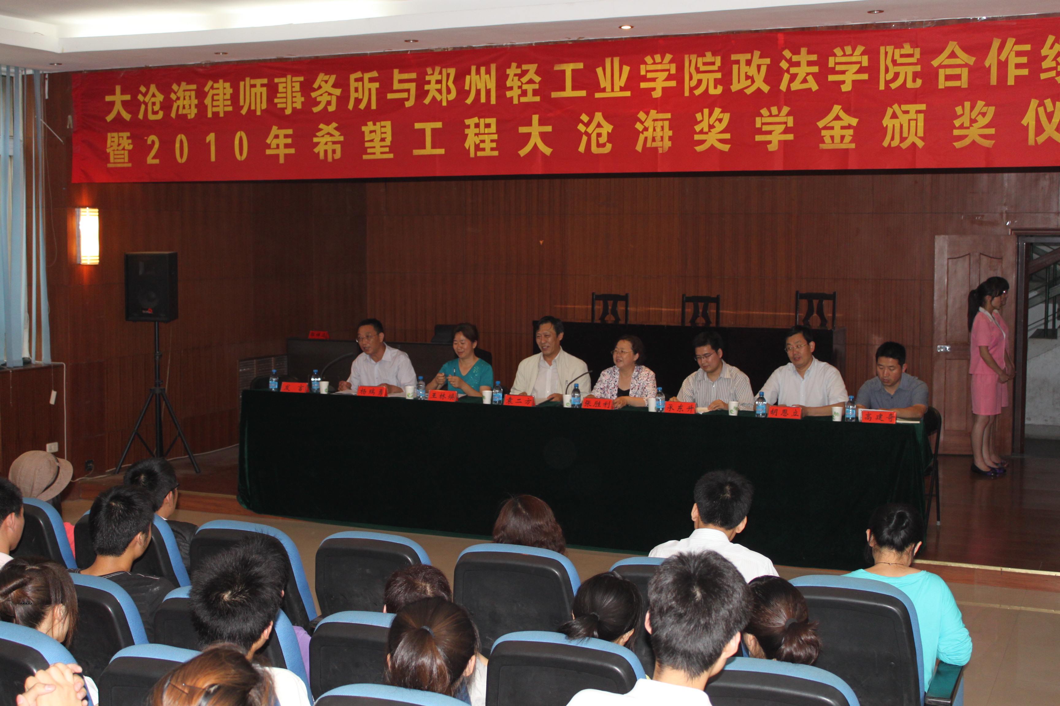 2010年5月27日下午3点,大沧海律师事务所与郑州轻工业学院政法学院合作续约暨2010年希望工程大沧海奖学金颁奖仪式在政法学院模拟法庭顺利召开。校党委副书记张胜利教授,河南省律师协会副会长、大沧海律师事务所所长袁二方先生,河南省希望工程办公室承东升先生,校学工部部长、学生处处长胡恩立老师、政法学院党总支书记王林焕老师,校团委副书记高建奇老师等应邀出席了大会。