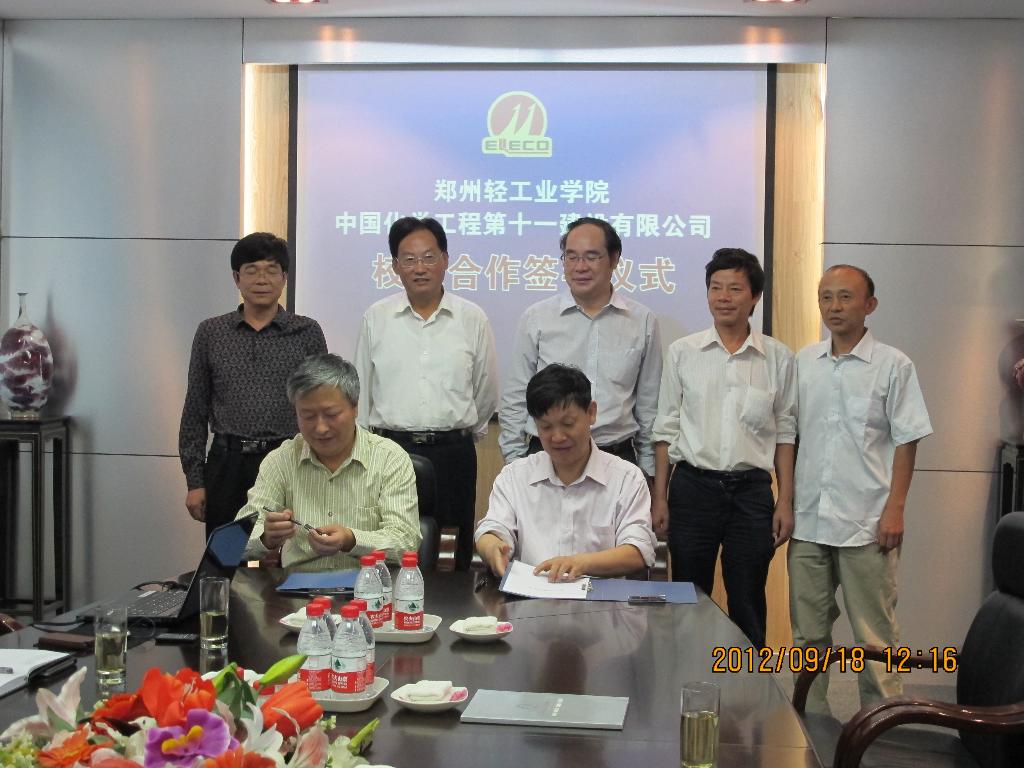 2012年9月18日,我校电气信息工程学院与中国化学工程第十一建设有限公司签订校企合作协议。电气学院院长崔光照教授、自动化系主任郑安平教授、电气工程系冯建勤教授、金楠博士以及第十一建集团党委副书记、纪检委书记刘广太,集团总工程师汤志强,集团总经理助理、一电公司总经理赵宏昌,副总工程师赵天安等参加。