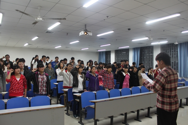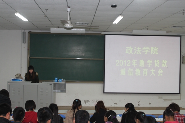 20121030日晚7:00政法学院在电教楼104教室召开2012年度国家助学贷款签订暨诚信教育大会。政法学院党总支副书记郭祥远老师、负责贷款的老师及贷款学生参加了会议。