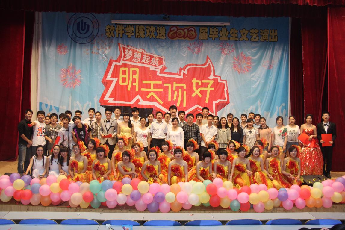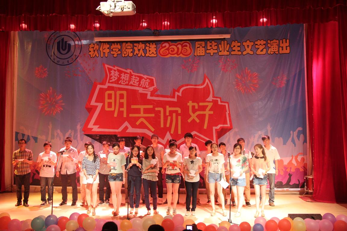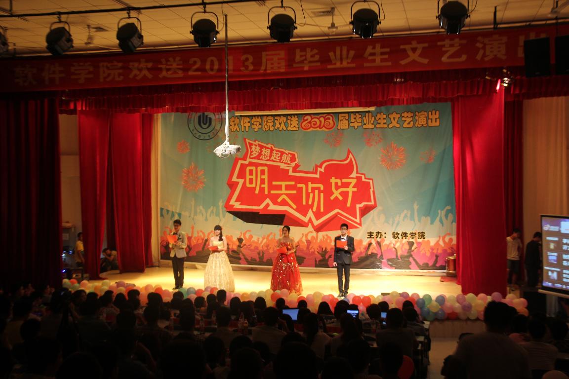 5月30日晚上,软件学院欢送2013届毕业生“明天,你好”文艺晚会在科学校区电教楼208隆重举行。软件学院党政领导,全体辅导员,教师代表与学生代表共500余人共同观看了演出。