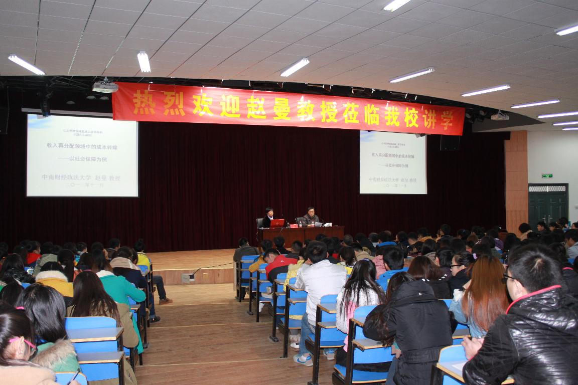 11月28日下午,中南财经政法大学博士生导师赵曼教授在科学校区学生活动中心208室,为政法学院师生作了题为“收入再分配领域中的成本转嫁——以社会保障为例”的学术报告。政法学院院长刘春兵主持了报告会,随同赵曼教授一起来我校开展学术交流的中南财经政法大学吕国营教授、李波教授、李春涛教授、张孜仪老师参加了报告会。