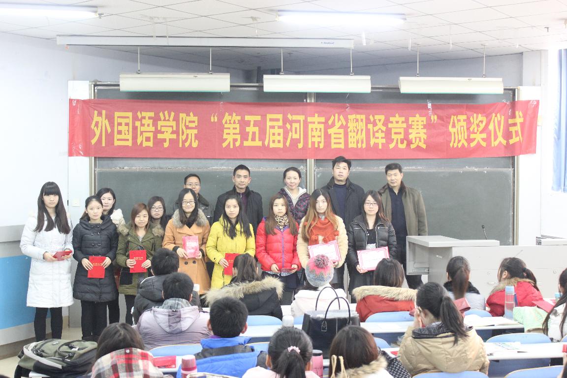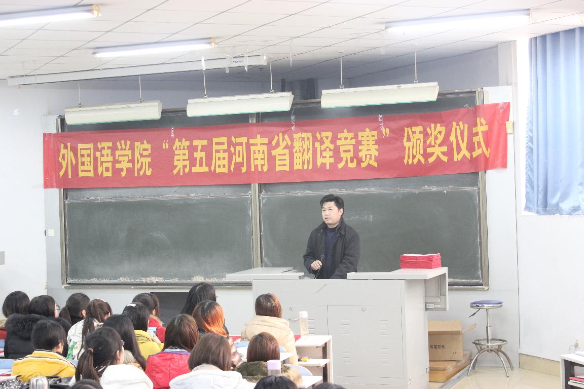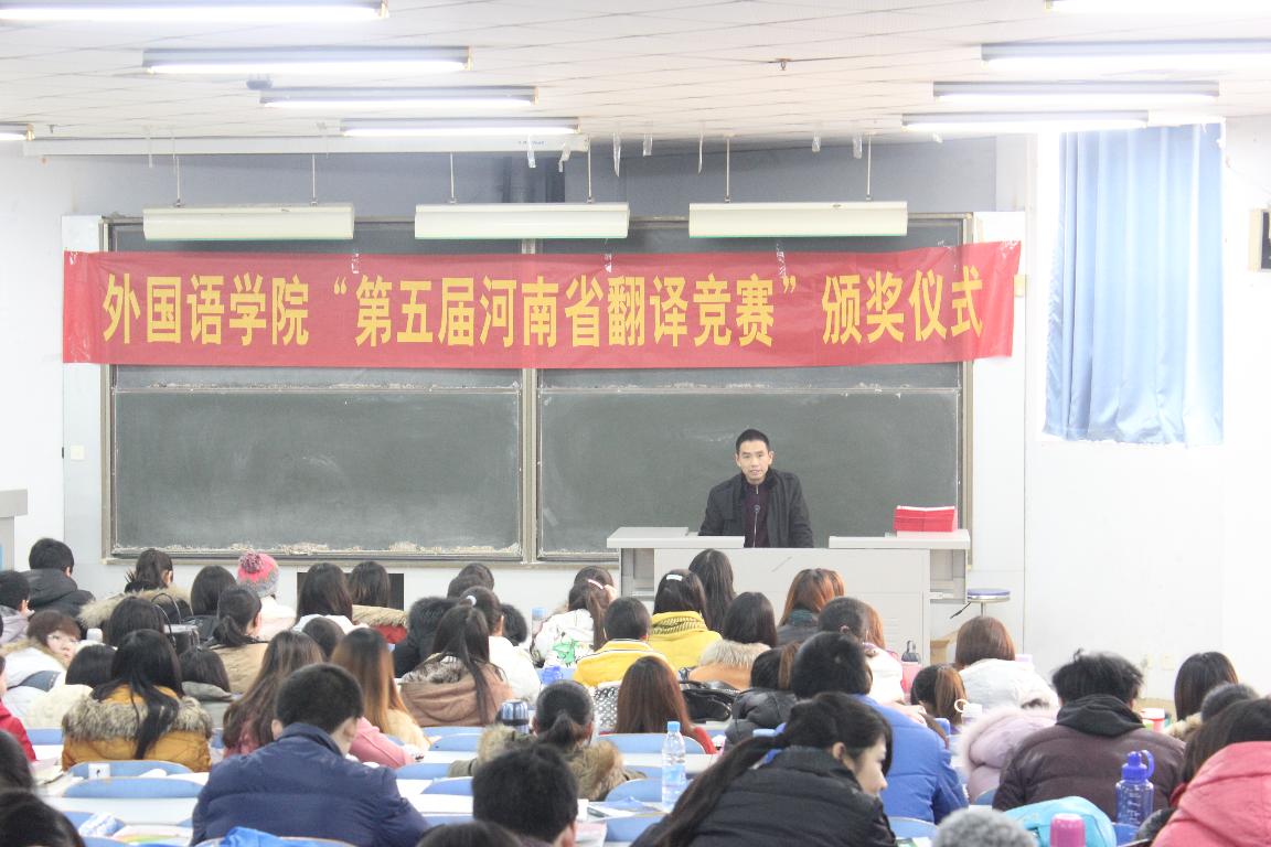 2013年12月19日下午,外国语学院“河南省第五届翻译竞赛”颁奖仪式在教三楼102教室隆重举行。外国语学院党总支书记杜红亮、副书记孔祥娟,专业教师宋国杰、聂韶峰以及全体英语系学生参加了颁奖活动。会议由外国语学院副院长周麦成主持。