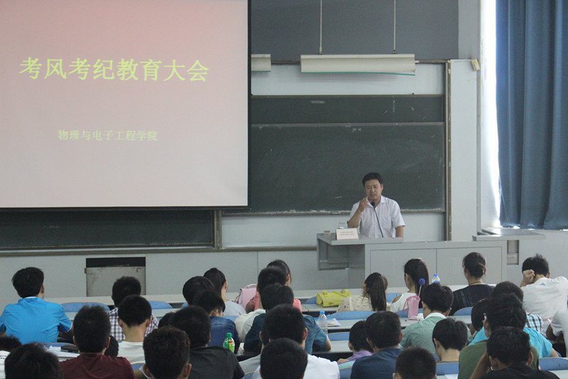 6月26日中午,物理与电子工程学院在教三楼202召开全院学生大会,进行诚信考试和安全教育,院党总支副书记黄晓鹏老师、全体辅导员和全体学生参加此次大会。