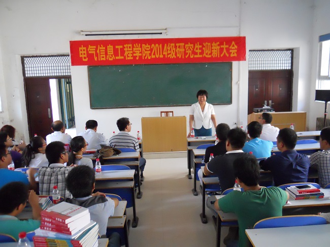 党总支书记曹玲芝教授发表了热情洋溢的致辞,她代表学院向2014级研究生来校深造表示欢迎,并简要介绍了学校、电气信息工程学院的发展历史和基本情况。曹书记在致辞中着重强调了电气信息工程学院的学科优势和实验平台优势,鼓励2014级研究生充分利用学校资源,培养自身科研能力。最后她对2013级研究生培养提出了明确要求:1.再接再厉,努力学习,掌握扎实的理论基础;2.转变学习方法,培养独立的设计和项目处理能力;3.加强交流和沟通,培养团结协作的能力。随后,杨院长就学院研究生培养进行了相关介绍。