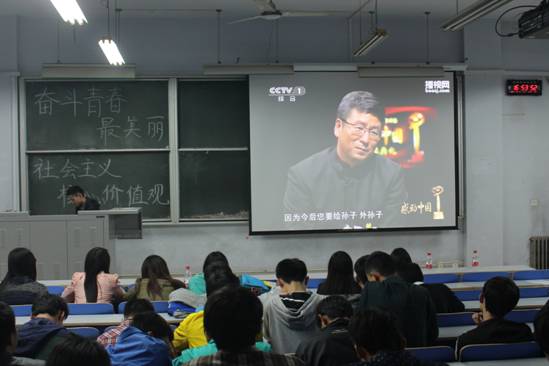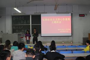 在活动的过程中,为了让同学们更深入的了解什么是社会核心价值观,团支书结合系列公益视频分别解读了“自由、平等 、公正、法治、爱国 、敬业、诚信 、友善、富强、民主、文明、和谐”这24个字的含义。然后讲述了“感动中国十大人物”中的杨善洲、马兰两位先进人物的感人事迹,让大家从现实人物中更进一步的了解现代人们应具备的人生观、价值观。随后,同学们又观看了《2014落马官员的监狱生活》,现实的案例引起同学们的深思和讨论。最后,几位学生代表,做了有关“我们当代大学生应该具有怎样的价值观及我们应该怎么做和能做些什么来培养自己正确的价值观”的报告,从切身实际出发,让同学们在讨论中自我反省、自我改变。