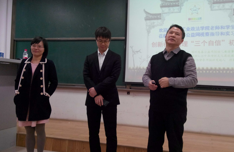 在此次讲座过程中,首先由两位深圳慈善公益网的高级主管分别谈了自己和社会工作结缘的故事,接着颜攀熙先生向在场的师生讲述了自己投身社会工作的经历和经验,还详细讲解了职业、行业与事业三者之间的关系,最后,他表达了自己希望同学们能投身社会工作事业中,为中国的慈善公益贡献自己的力量。