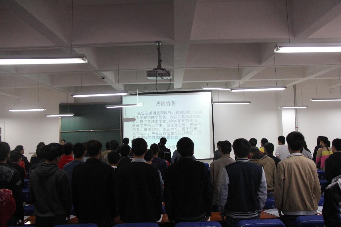 签约手续完毕后,全体贷款同学进行了集体诚信宣誓,表示一定会珍惜机会,努力学习,自强不息,诚信做人,以优异的学习成绩和良好的信誉回报母校和社会。此次大会的成功举行也为我院助学贷款工作健康、持续、良性开展打下了坚实的基础。