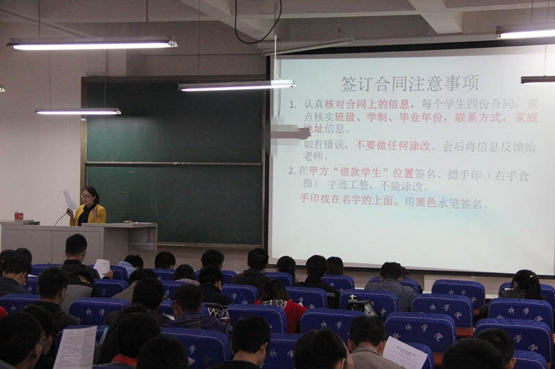 随后,李辉老师详细介绍了贷款合同签订相关事宜,并指导学生签订了2014年度贷款合同,最后对同学们有关合同的疑问一一解答。