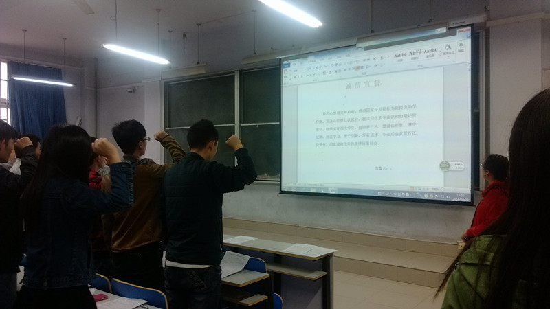 周芳华老师组织同学们认真核对了贷款合同的所有个人信息,确保了信息的准确无误;带领学生认真做了诚信宣誓,告知了贷款合同签订的注意事项,当场监督学生完成了贷款合同的签订工作。周芳华老师还勉励同学们要严格诚信的履行贷款事项,珍惜此次国家开发银行提供的助学贷款机会,用真诚和优异的成绩来回报学校和社会。