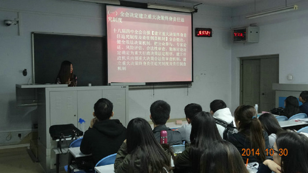 学习会上,学生支部书记带领全体学生观看了十八届四中全会内容视频,学习了全会召开的背景与意义、会议公报的内容与精神要点,并围绕着全会公报中提出的全面推进依法治国的“总目标”、“五个体系”、“六项重大任务”等主要内容,分享了学习心得。在交流中,同学们对“依法治国”有了全面的认识,同时也更加明确了当代大学生身处伟大变革年代下的时代使命。