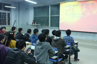 2012级电子科学与技术专业1班团支书张雪珂带领同学一起回顾了“一二•九”运动的历史背景、运动情况及其历史意义。