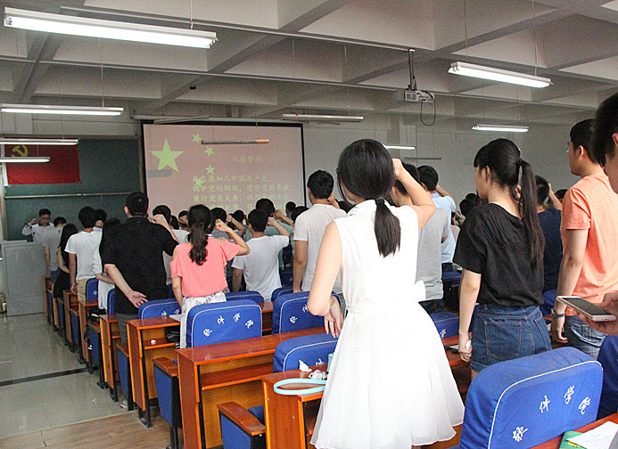 活动开始,伴随着雄壮激昂的《国际歌》,全体党员面对党旗肃立并举起右手,在学生党员李学辉和黄晓龙的领誓下,庄严宣读入党誓词,重温那神圣而又光荣的时刻。铿锵坚定的宣誓声再次震撼每位党员的心灵,也深深感染着在场的积极分子。随后,正式党员代表、预备党员和积极分子代表依次发言,表达了全体党员对党的忠诚与热爱以及积极分子加入中国共产党的追求与决心。李辉老师在总结发言中强调全体党员要牢记党旗下的誓言,提高政治素养,坚守理想信念,在学习生活和各项活动中充分发挥党员先锋模范作用;鼓励积极分子要寻找自身差距,不断完善自我,争取早日加入中国共产党。