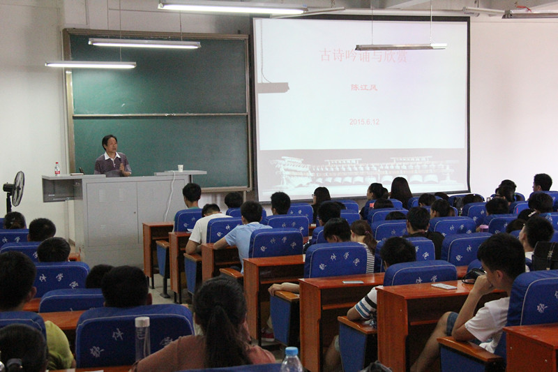 报告会上,陈江风教授首先从文化的概念谈了自己的见解,认为文化是人类活动的模型,有其特定的符号系统和结构,并针对此概念认真讲解了中西方文化各自的特点;陈校长还介绍了自身为传承、保护和发展非物质文化遗产所做的努力,并勉励大家要继承和发扬中国传统文化,并以批判的眼光吸收外来文化。最后,陈校长重点讲解了古诗吟诵与欣赏的概念、方法和基本调,并同现场师生一起声情并茂地吟诵了古诗。