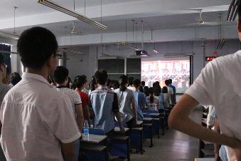 上午9时,物理与电子工程学院全体学生在东一楼318集体观看了中国人民抗日战争暨世界反法西斯战争胜利70周年纪念活动和阅兵活动电视直播。国歌唱起时,全体与会师生集体站立,心潮澎湃。国家领导人和参加阅兵活动外宾登上天安门城楼时,国家领导人神情自信而坚定,泱泱大国风范引起了现场热烈掌声!当一队队阅兵方队走过阅兵区,方阵动作整齐,战车隆隆,装备先进,展示了我国强大国防和维护世界和平的实力与能力。参阅将士目光坚韧,神情坚定,展现了我国军人维护国家安定和世界和平的坚定决心与坚强意志。同学们盯着屏幕,神情专注,自豪之情溢于言表,吱吱赞叹,阵阵掌声掀起了阵阵热潮。最后,当象征着和平团结的和平鸽与气球腾空而起时,教室里响起了经久不息的热烈掌声。