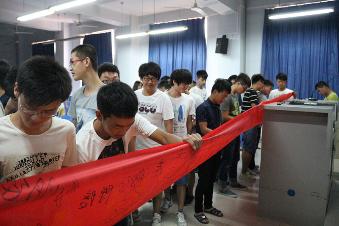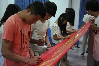 观看纪念活动和阅兵直播后,物理与电子工程学院组织大家举行了签名明志活动,同学们在“铭记历史、缅怀先烈、珍爱和平、开创未来”的条幅上纷纷签上了自己的名字。