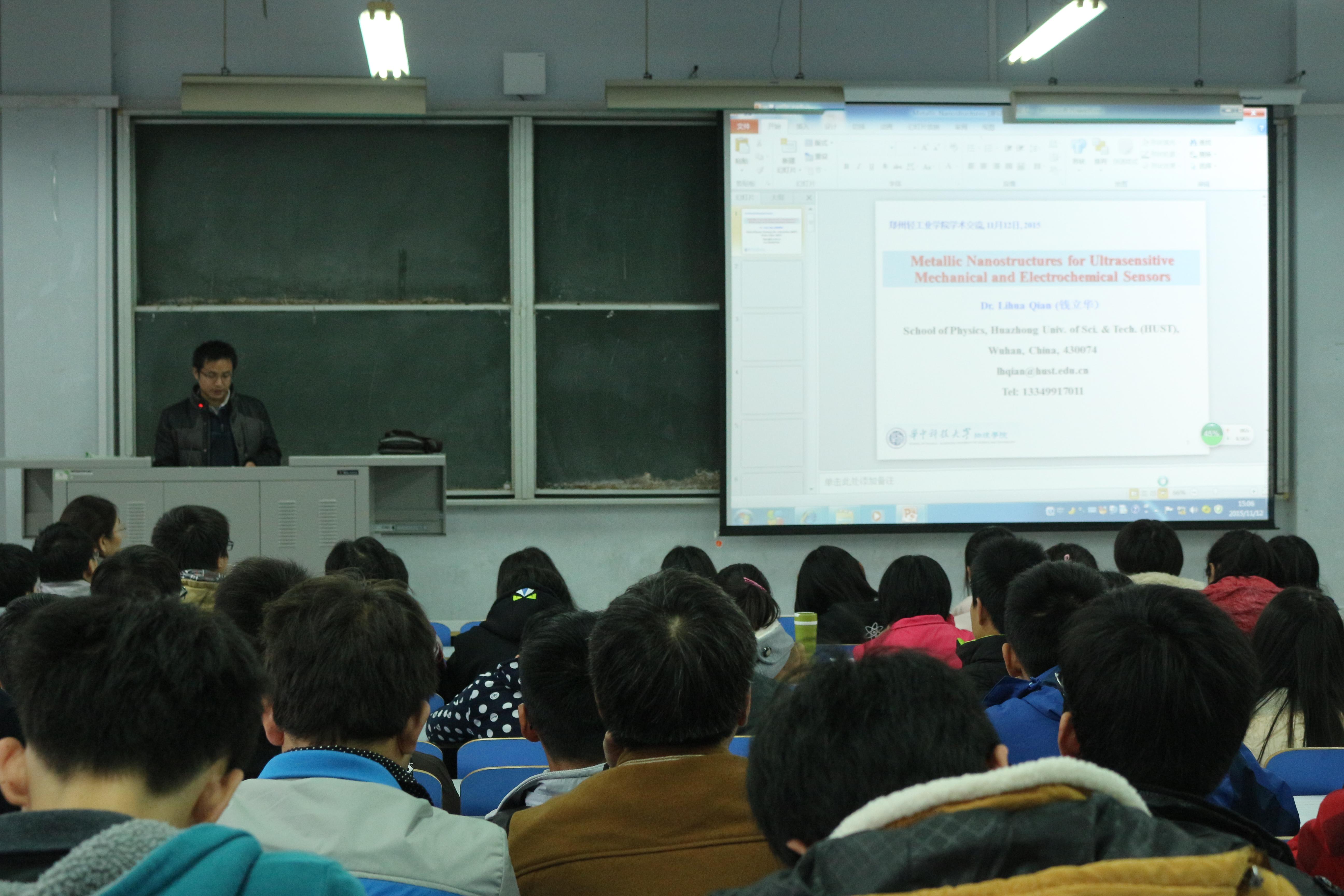 2015年11月12日下午,华中科技大学博士生导师钱立华教授应我校物理与电子工程学院邀请,在我校东风校区东一楼318教室作了题为“金属纳米结构的力学和电化学传感性能”的学术讲座。本场讲座由物理与电子工程学院院长苏玉玲教授主持。讲座中钱立华教授围绕“金属纳米结构的力学和电化学传感性能”详细介绍了:(1)多孔金属复合材料在电化学传感器方面的应用;(2)单层纳米粒子阵列的制备和在应变传感方面的应用。通过自组装方法在柔性基底上制备金的纳米粒子薄膜即使在20000赫兹的振动频率下仍有较好的电学响应,在声音探测方面具有广阔应用前景,引起了我校师生的极大兴趣。
