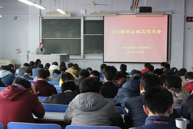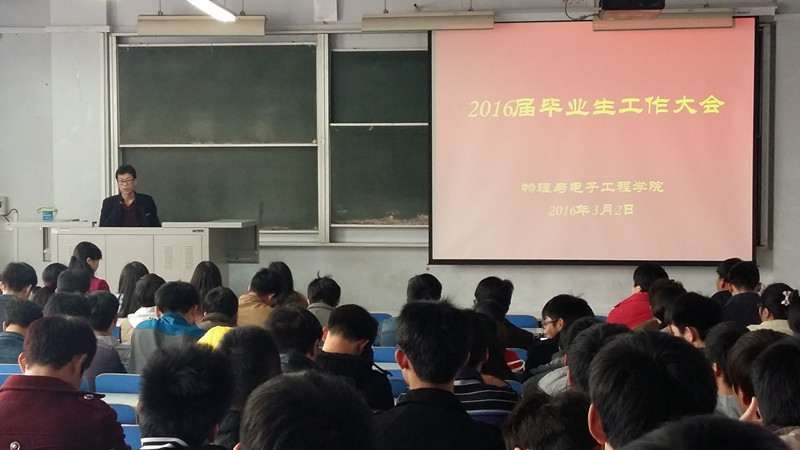 新学期为了进一步帮助毕业生树立正确的就业观和择业观,引导毕业生积极就业,协调处理就业、考研、毕业设计等方面的关系,积极推动我院毕业生工作的顺利开展,2016年3月2日下午3:00物理与电子工程学院在东一楼318教室召开2016届毕业生工作大会。学院副院长王永强、党总支副书记李玲、辅导员老师以及2016届全体毕业生参加了会议。