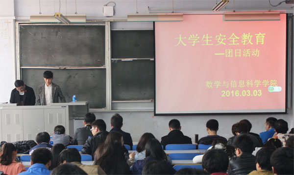 为了让同学们提高安全意识,加强校园安全教育,保障学生安全,3月3日下午14:30分,数学与信息科学学院于东一楼218开展了以“珍爱生命,安全先行”为主题的班会,二年级全体同学参加了此次活动。