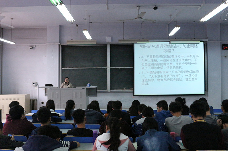此次讲座主要围绕网络安全知识展开,向同学们讲授了在日常上网聊天交友、浏览网页、网络购物需要注意的各种安全问题,并告诉同学们怎样避免遭遇网络陷阱,防止网络欺骗;如何提高法律意识,预防网络犯罪。最后用大学生遭遇网络陷阱的实例,提醒同学们警惕网络诈骗,珍爱生命;要求同学们在自己不上当受骗的同时,也要留意身边的同学有没有参与此类活动,若有异常要及时制止,避免此类悲剧发生。