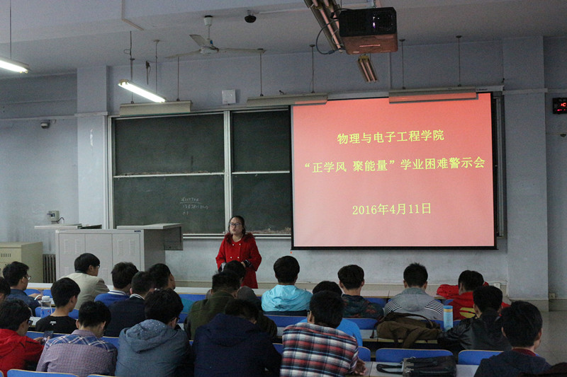 4月11日下午,物理与电子工程学院在东一楼318召开了“正学风聚能量”学业警示会。我院辅导员周芳华老师和各年级学业困难学生参加了大会。