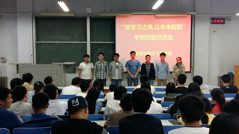 为了促进我院学风建设,激发同学们对考研的热情,也进一步的帮助同学们了解考研形势,掌握考研技巧,4月15日晚7点30分,物理与电子工程学院在东一楼318举办了以“扬学习之帆,让未来起航”为主题的考研经验交流会。本次交流会邀请了我院2016届成功考取研究生的优秀学生代表为在场的同学们传授经验。